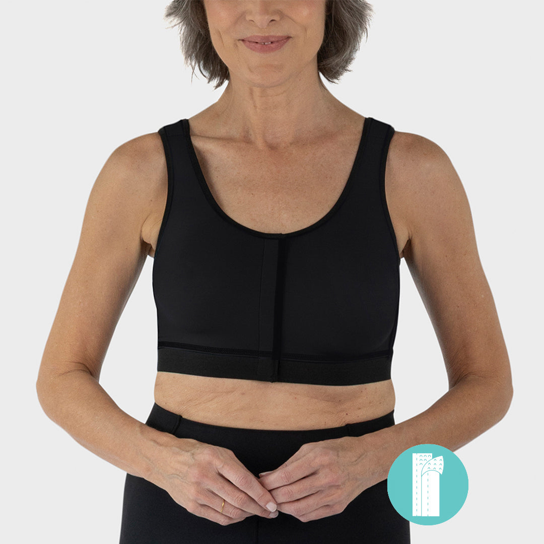 This bra provides gentle support and targeted compression immediately following mastectomy, reconstruction, lumpectomy, fat grafting—whether reconstructive or aesthetic, and cardiac surgery. Featuring ultra-soft non-pocketed cups, adjustable Velcro® closures, and antimicrobial, cooling fabric, it’s made to deliver comfort and ease throughout the healing process.