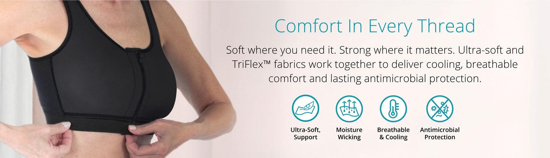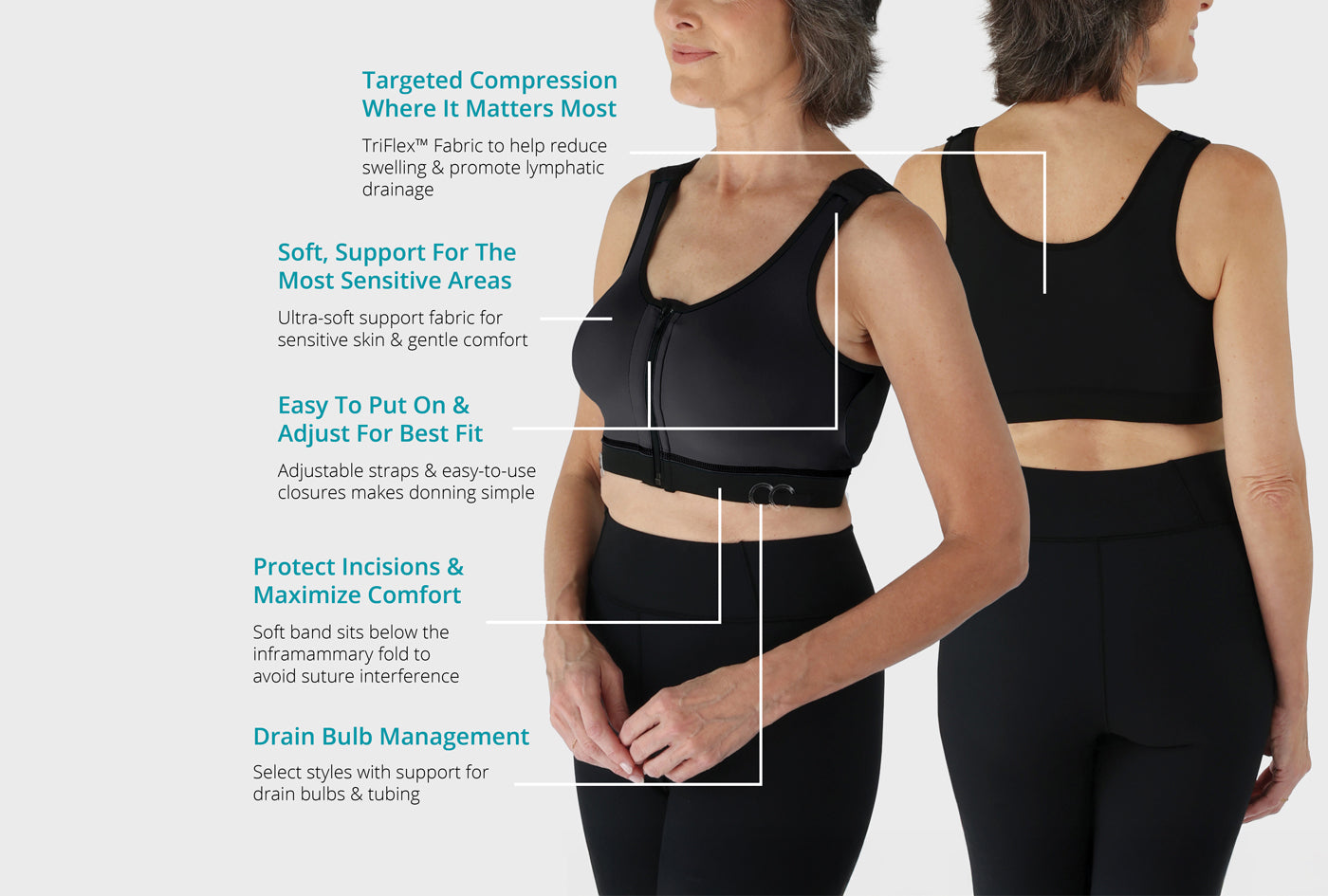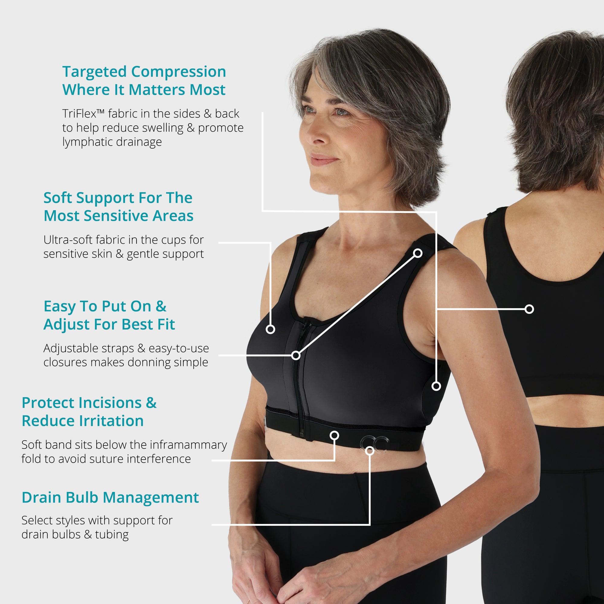 Ultra-soft fabric in the front and cups provide gentle support after surgery & throughout