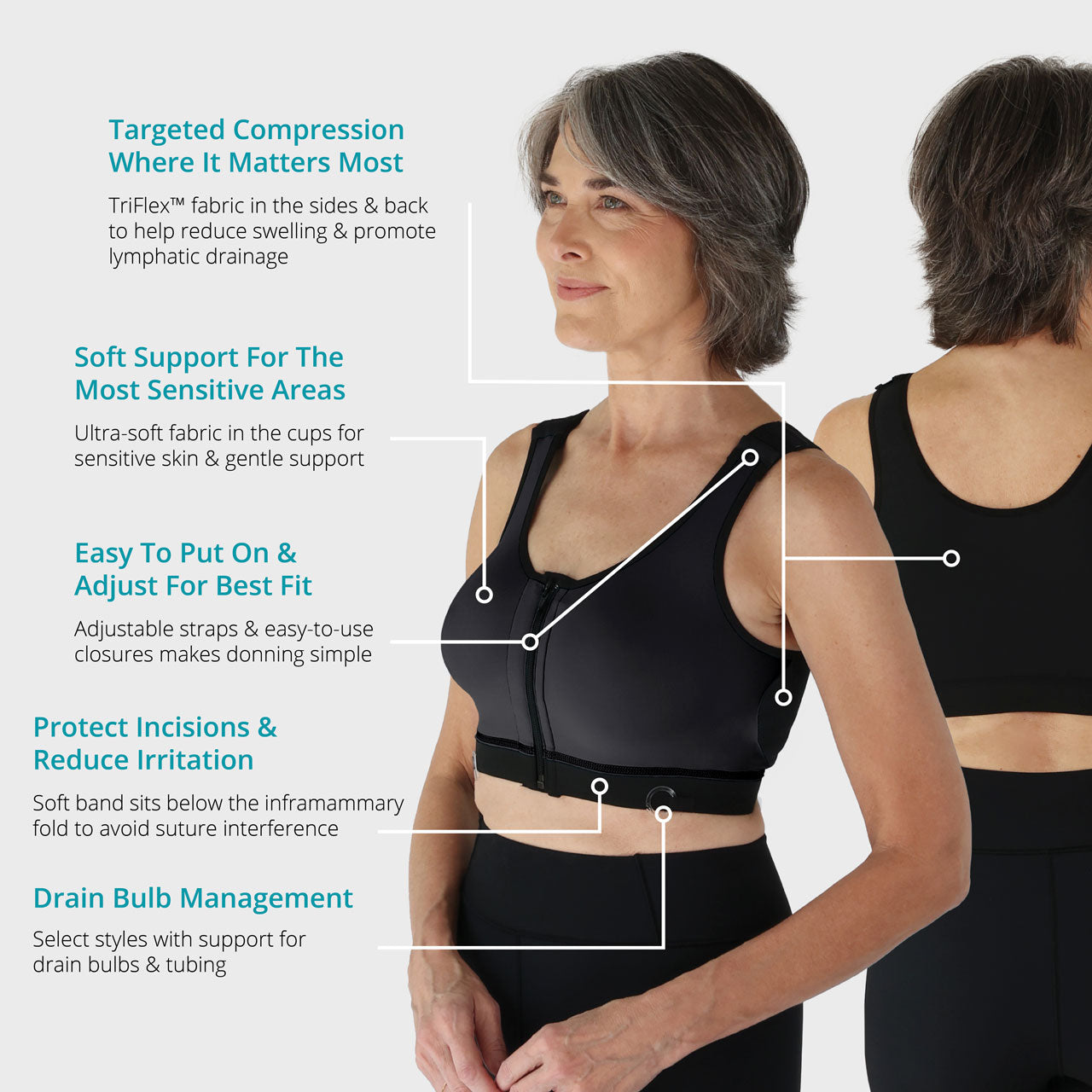 Ultra-soft fabric in the front and cups provide gentle support after surgery & throughout