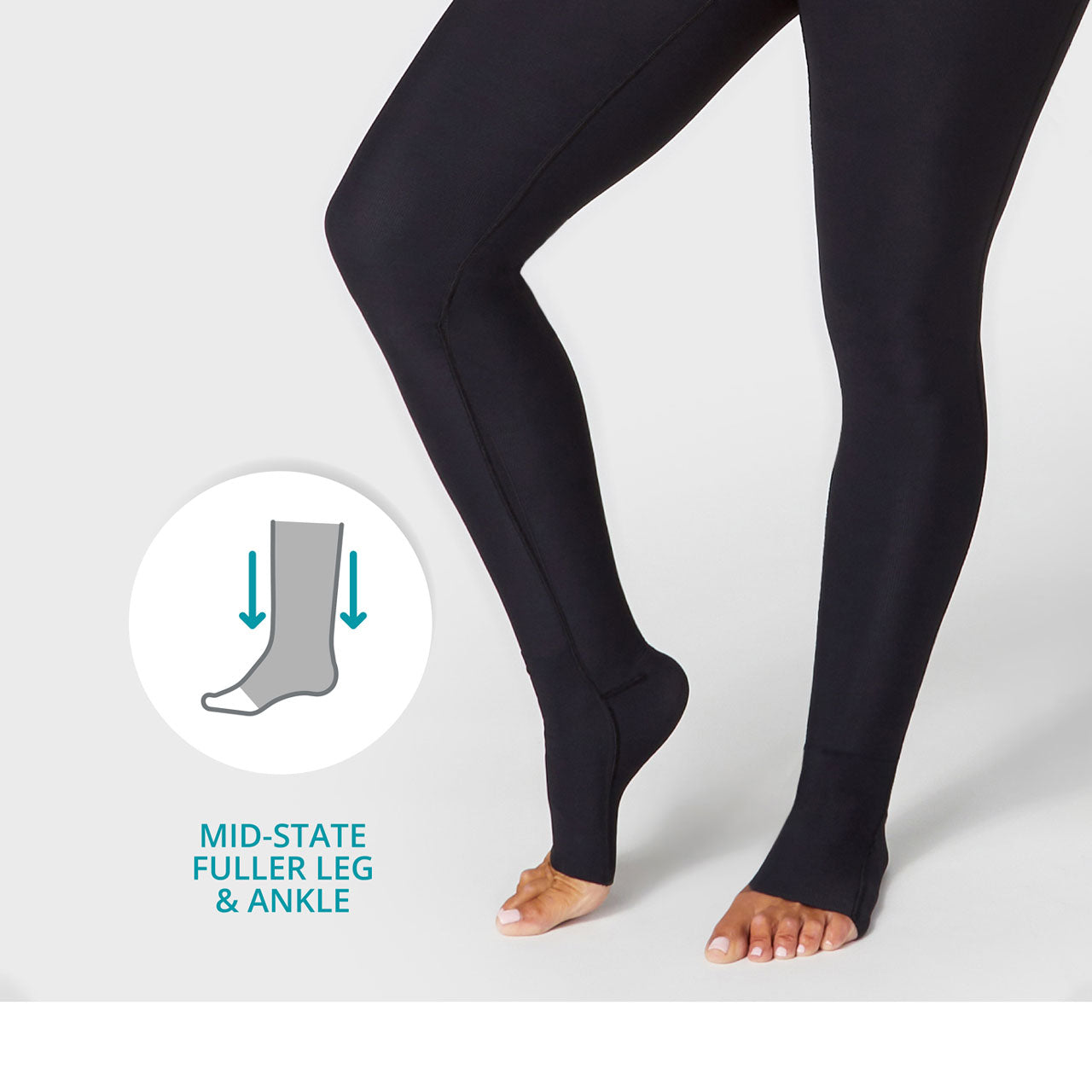Our Lipedema Mid-State Everyday Management Legging™ is designed with a fuller leg and ankle silhouette to accommodate these more enlarged areas of the body without causing discomfort or constriction.
