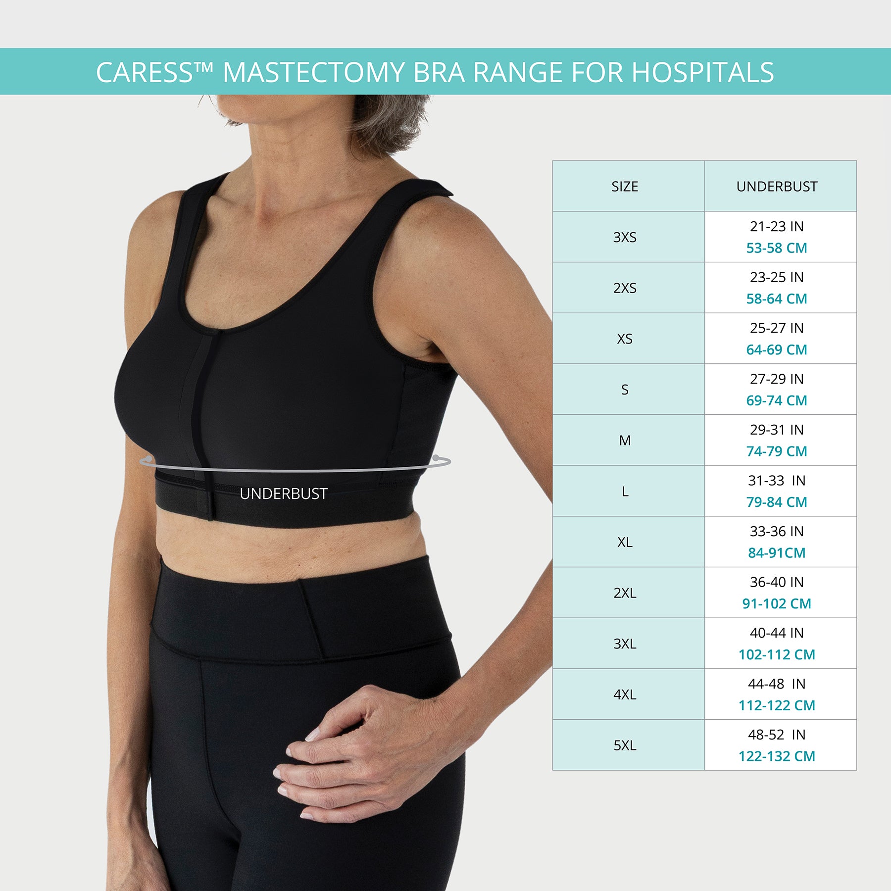 Third, take the patient's measurements and compare to the Caress Surgical Bra size chart to determine the correct size. If the patient is between sizes, we recommend sizing up.